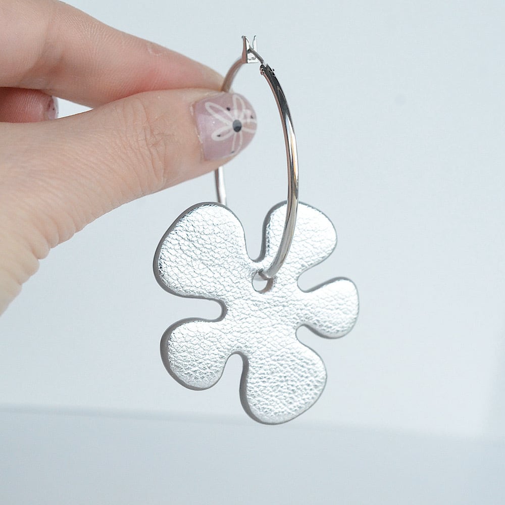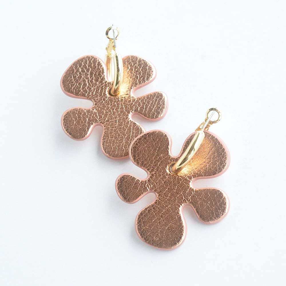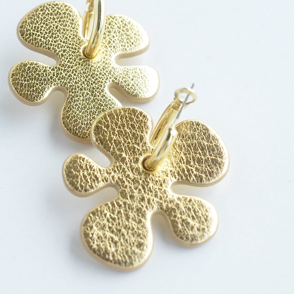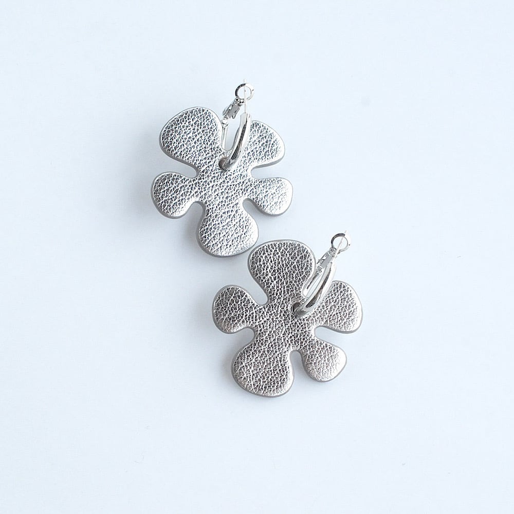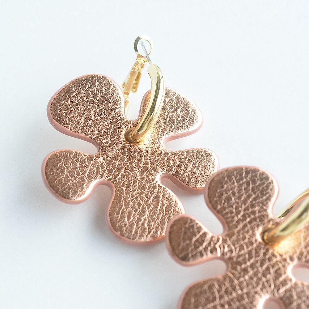 コーディネートをぱっと華やかにしてくれる、クッキーのようなお花モチーフのレザーピアス。