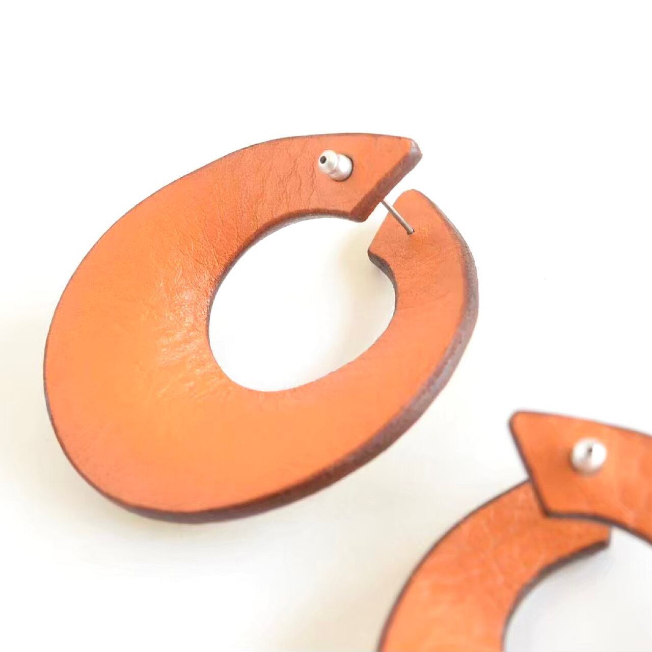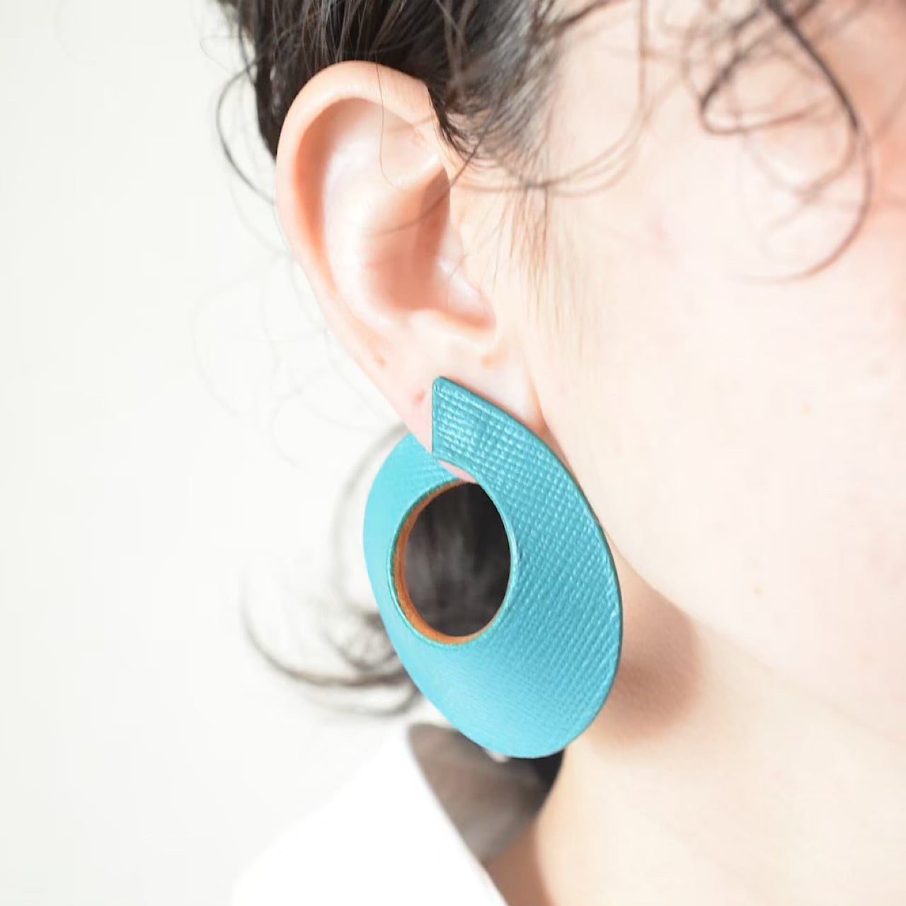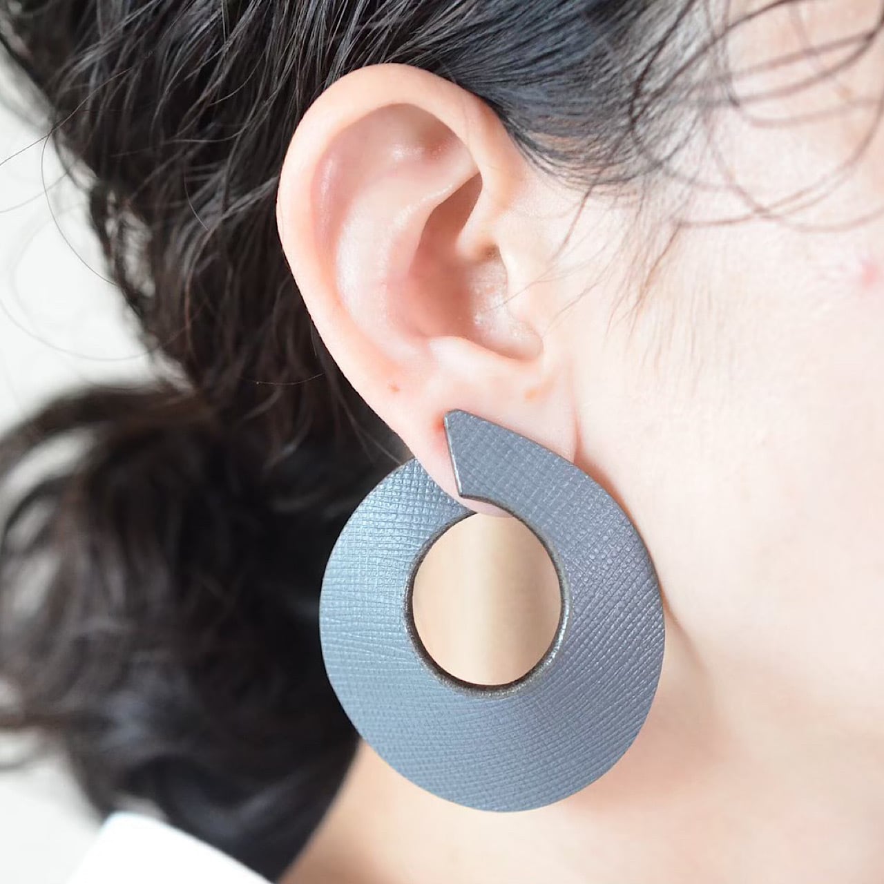 金属アレルギーが出にくいチタン製のポストをレザーに埋め込むことで安定感が増し、耳に触れる金属はチタンのみになるように作っています。