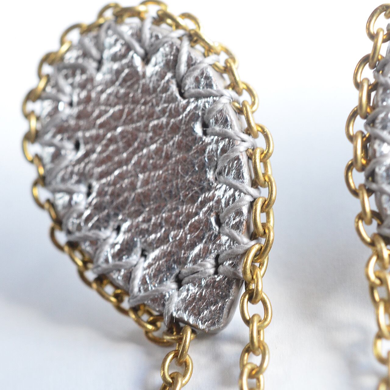 雫型レザーのコバはFENICE社製の水性コバ塗料できれいに仕上げ、そこに真鍮のチェーンを独自の縫製で縫い付けています。